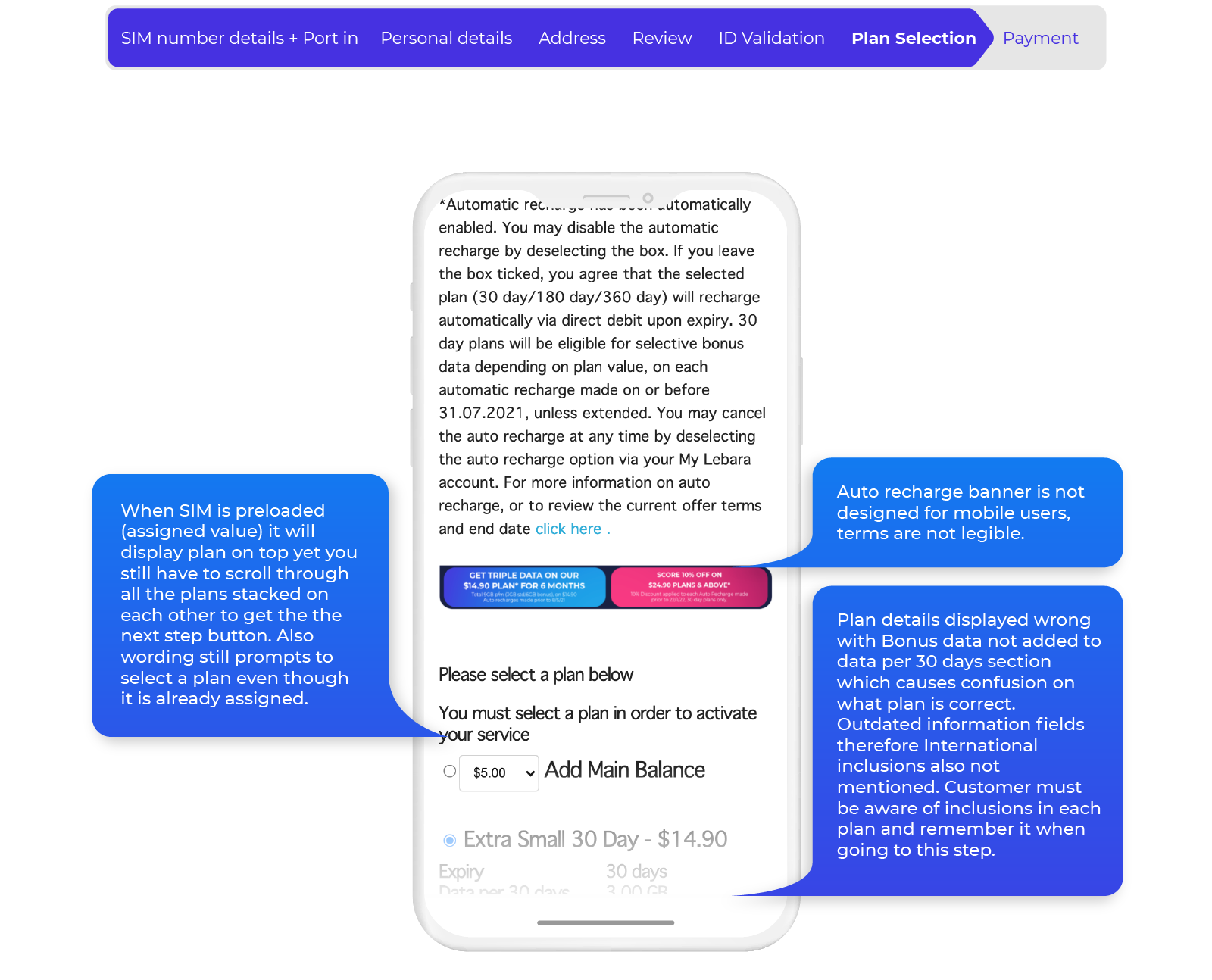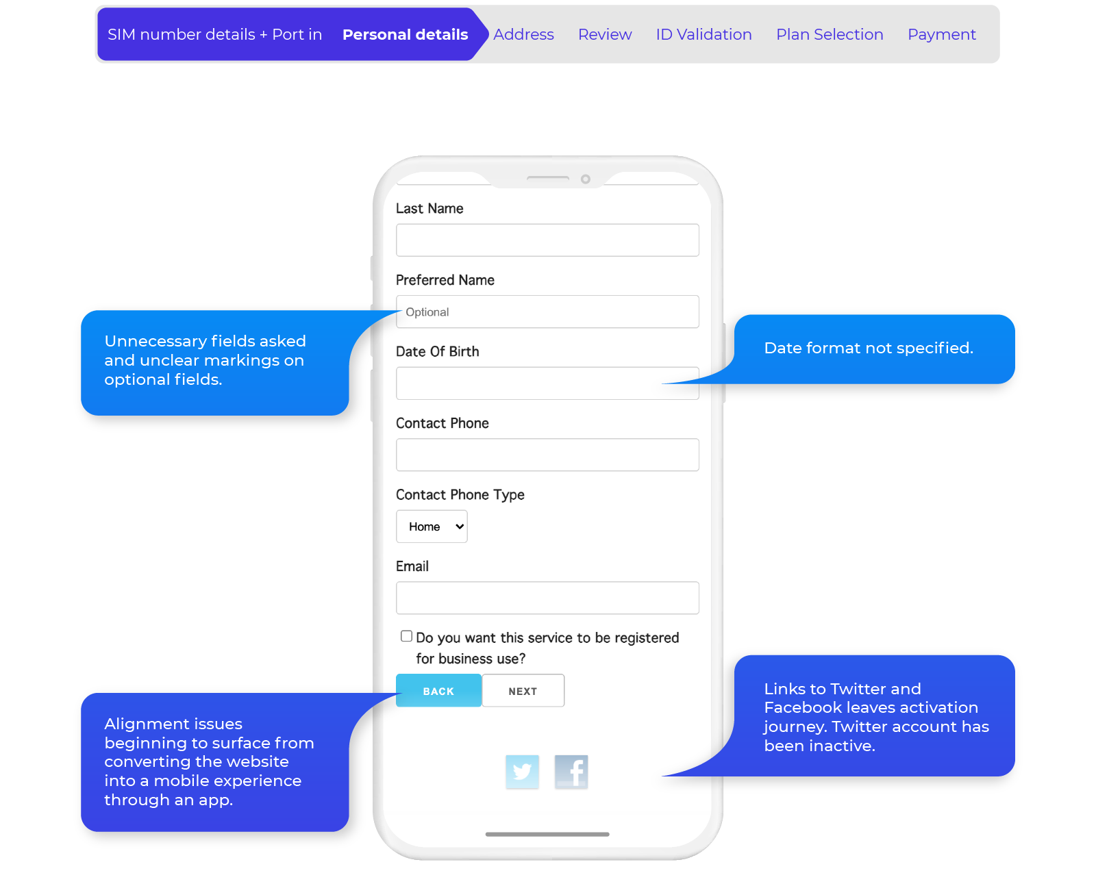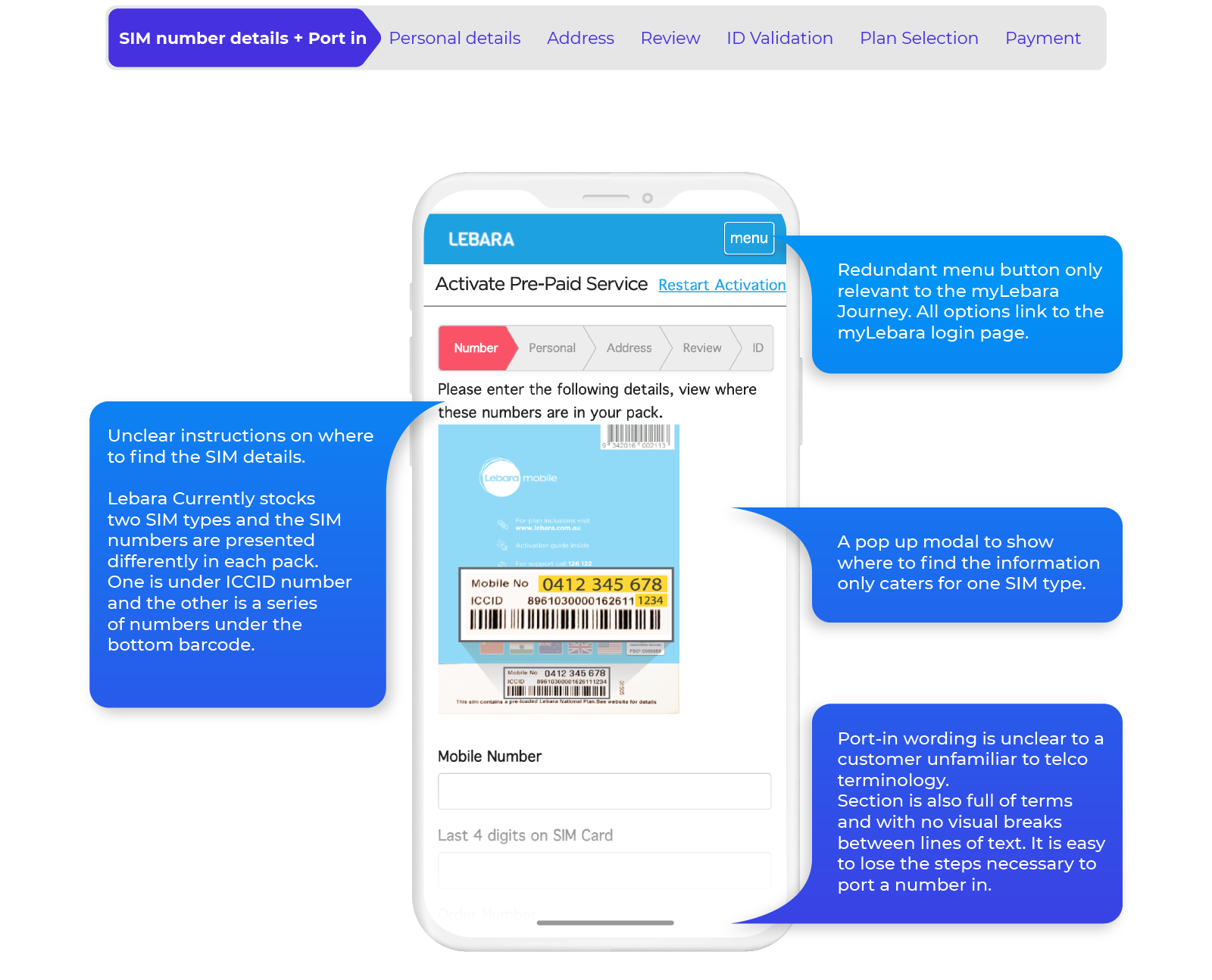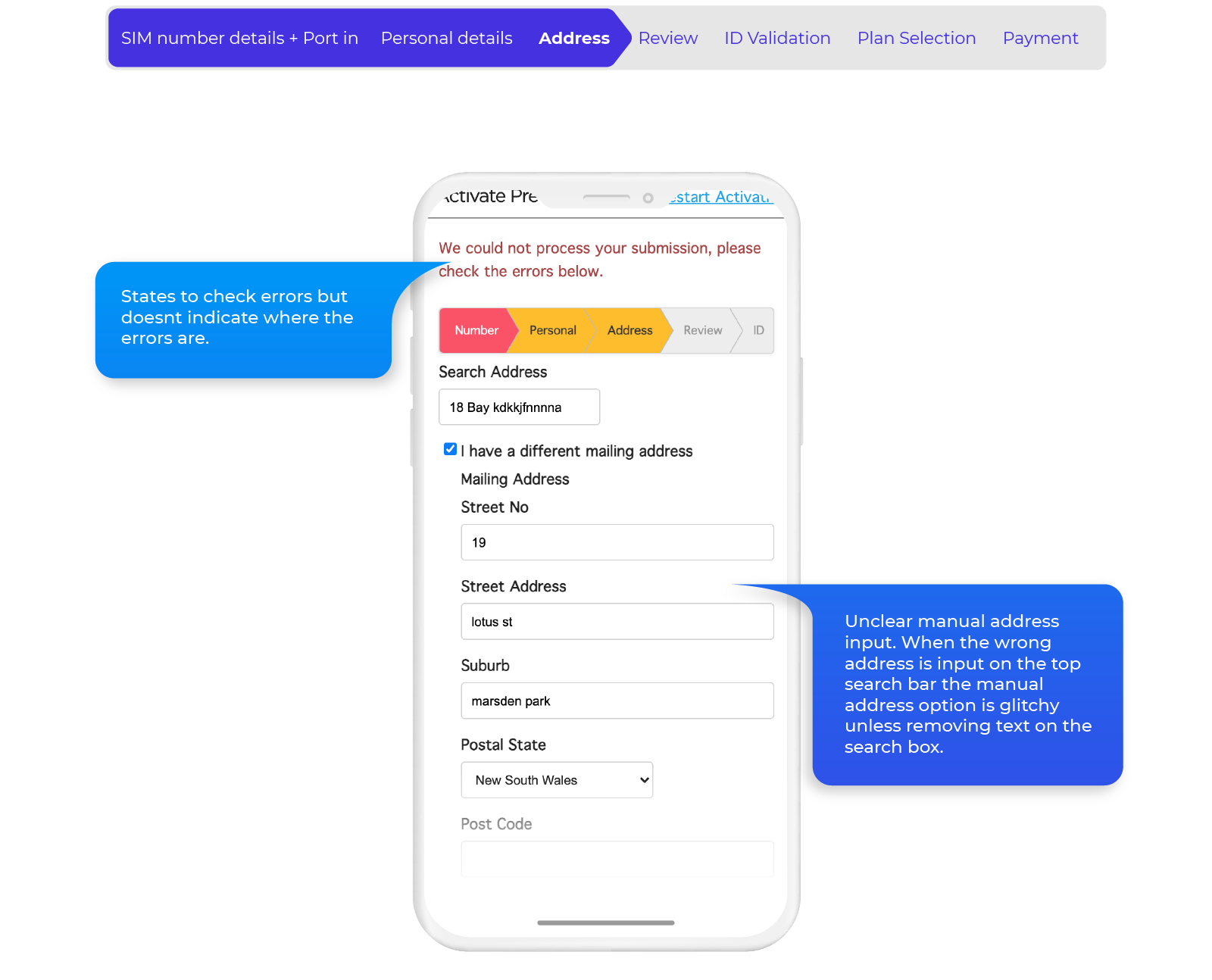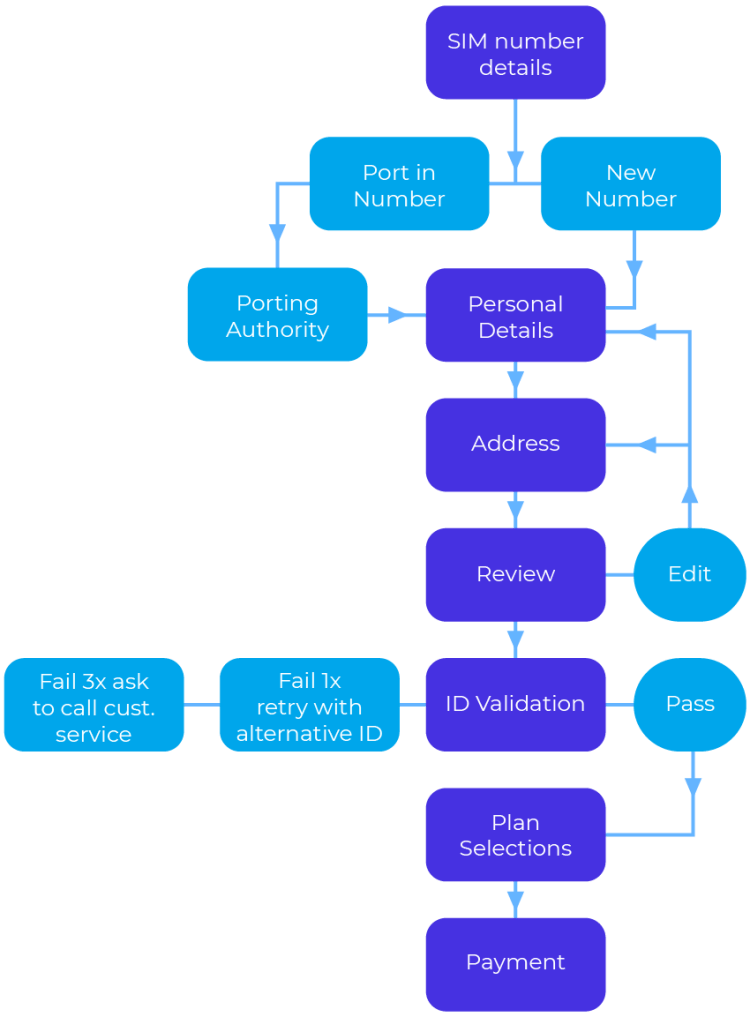 SIM number details + Port in > Personal details > Address > Review > ID Validation > Plan Selection > Payment
