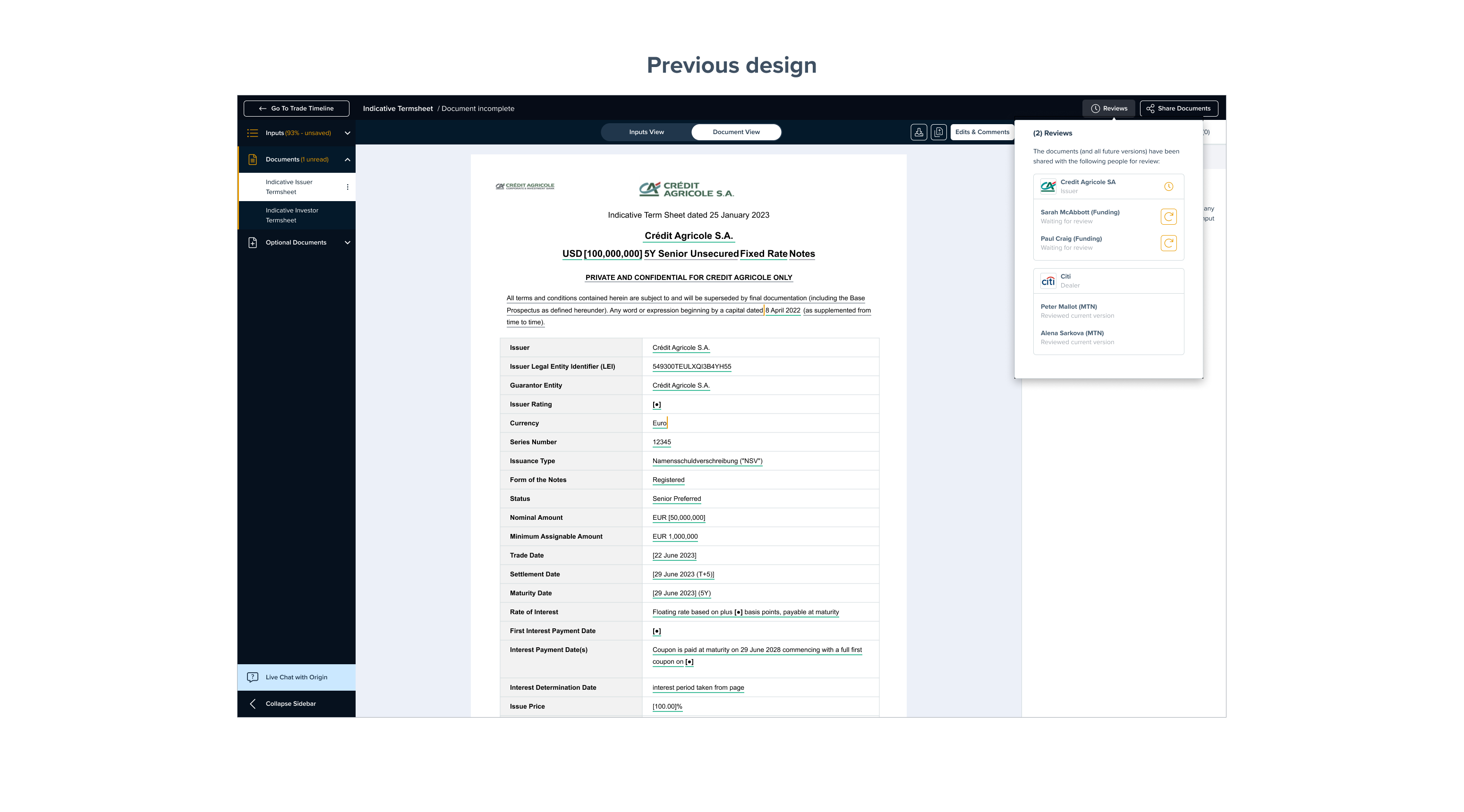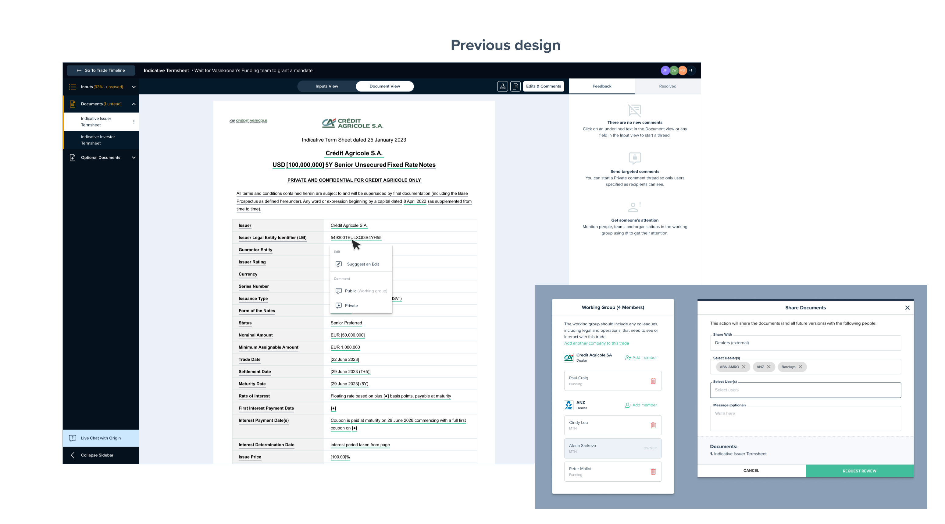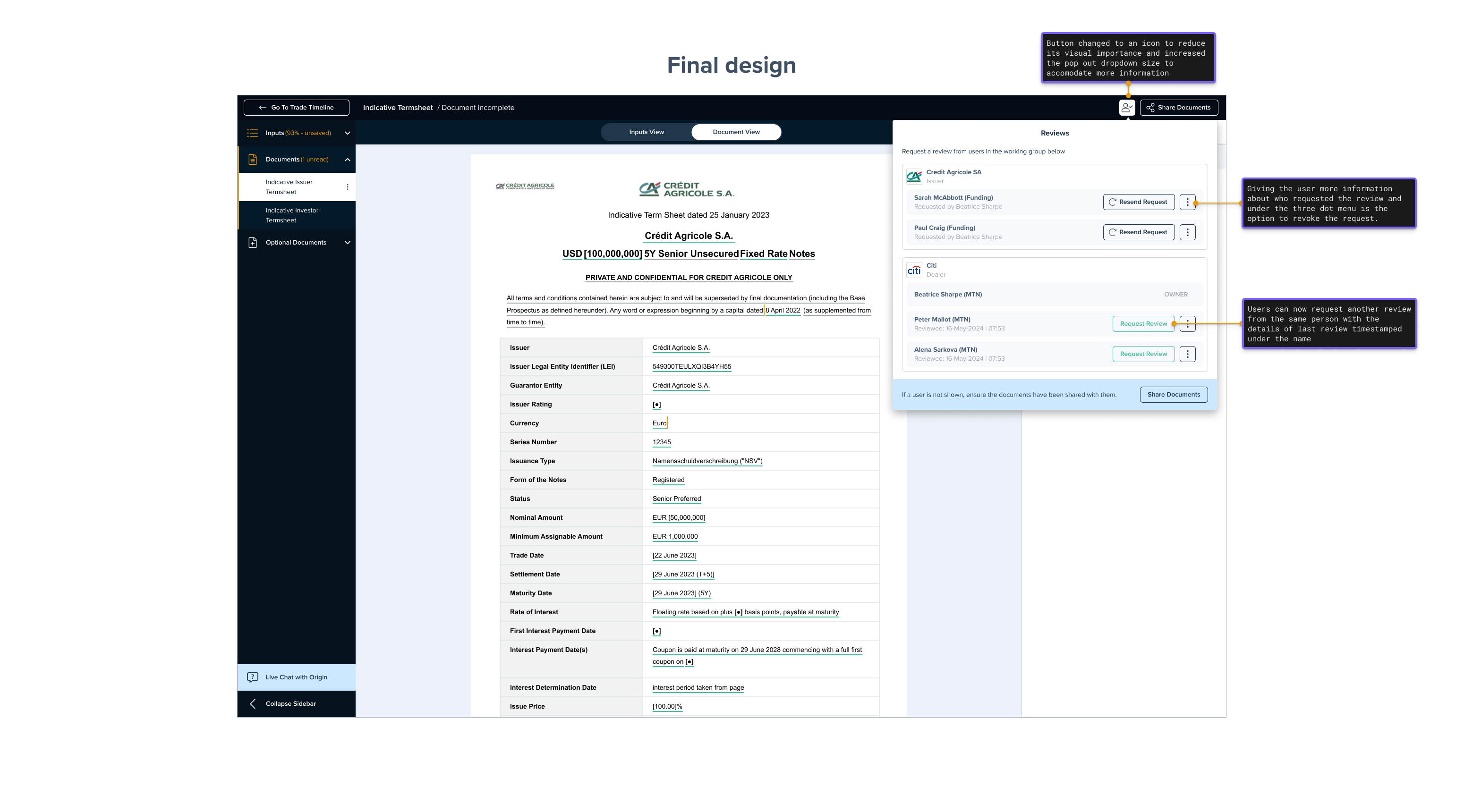 The format of the workflow was fixed to Document preparation > reviews > share with issuer > mandate > trade completion. This meant that the assumption is that the preparation of the document and reviews is done internally for the dealer then when the document is ready for mandate it is sent to the Issuer. Once a review is done by one person, they cannot be requested for a review again. In reality our users work in a more fluid way than this with many back and forth communication internally as well as with the issuer and reviews to be done multiple times. Further to this the way reviews are shown on the timeline makes it seem that pending reviews means the trade cannot progress, even when the tree does progress the pending reviews remain in view making it seem like the documents were never reviewed. Another common feedback we received was around the drafting parties not being sure when a user has completed the review. We currently have a “Mark review as compeleted” action however because of the way we have set up commenting to be real time as opposed to changes, users will receive comments or suggestions as they are posted so at times someone will write a comment and continue reviewing , the editor will see the comment, make the change and resolve the comment but with no indication of the actions the initial commenter thinks they have lost their comment.