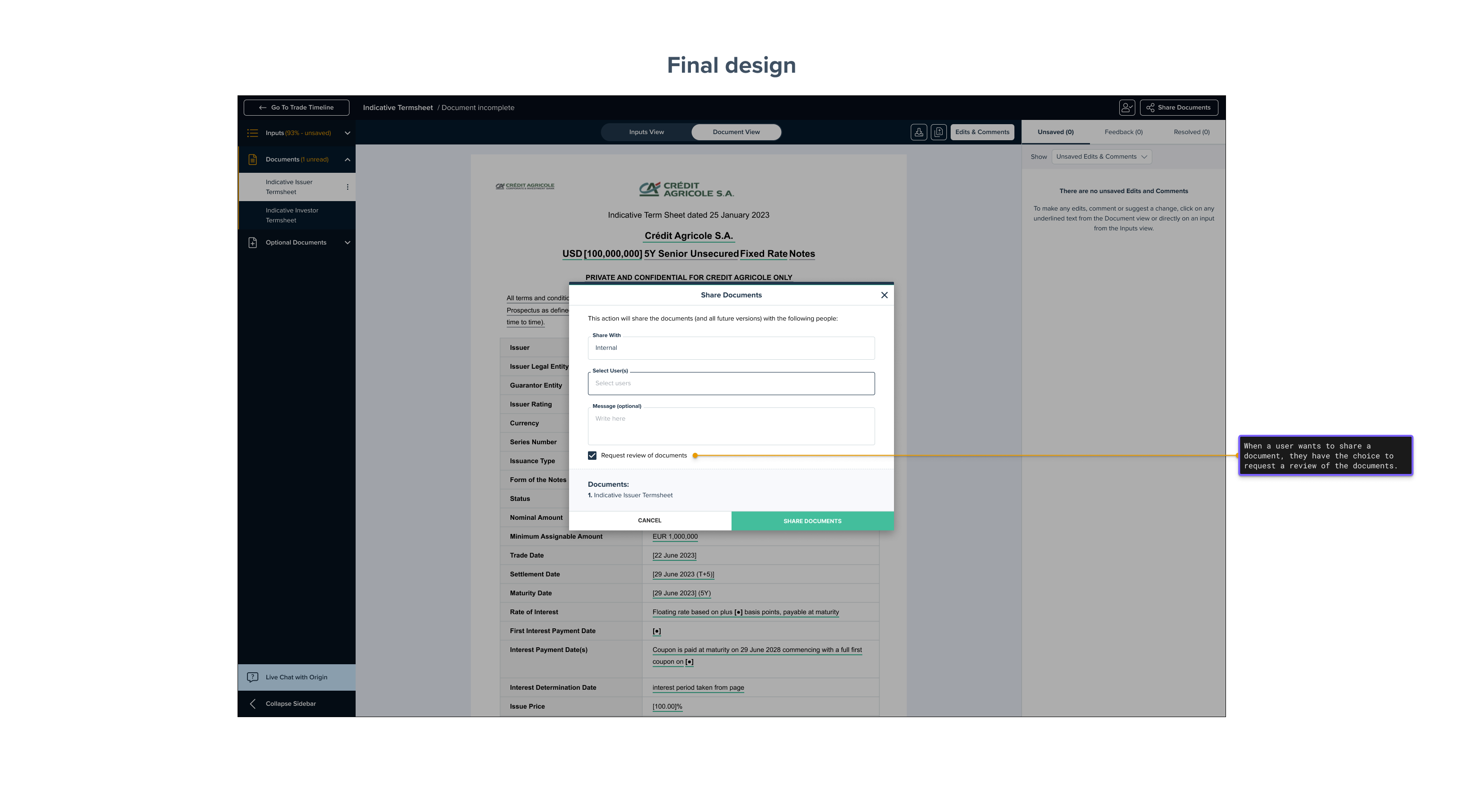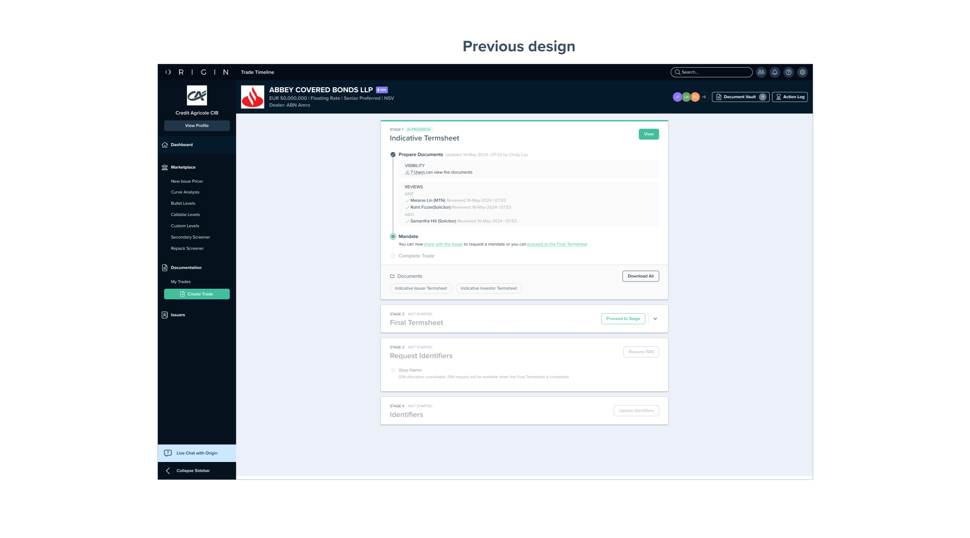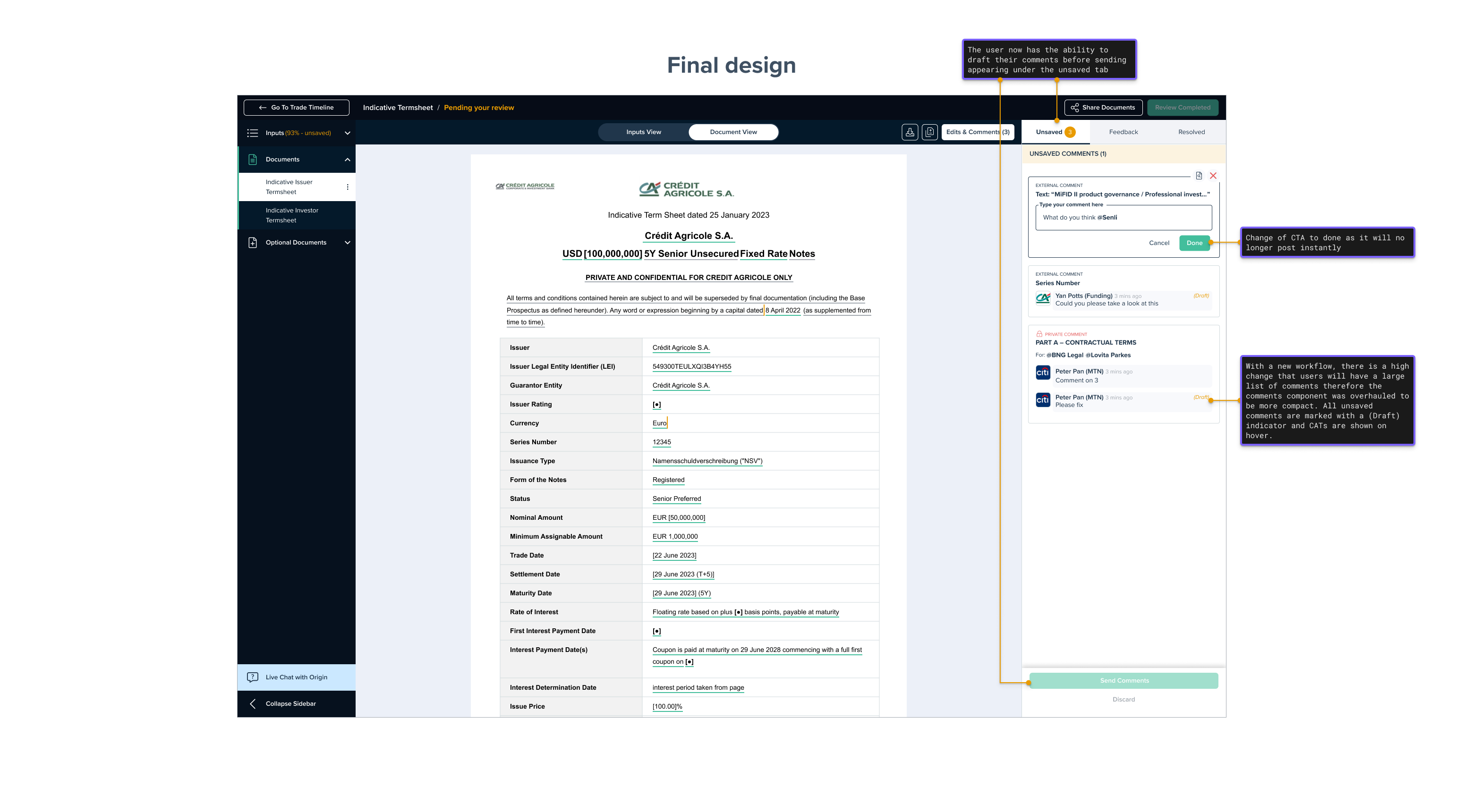 The format of the workflow was fixed to Document preparation > reviews > share with issuer > mandate > trade completion. This meant that the assumption is that the preparation of the document and reviews is done internally for the dealer then when the document is ready for mandate it is sent to the Issuer. Once a review is done by one person, they cannot be requested for a review again. In reality our users work in a more fluid way than this with many back and forth communication internally as well as with the issuer and reviews to be done multiple times. Further to this the way reviews are shown on the timeline makes it seem that pending reviews means the trade cannot progress, even when the tree does progress the pending reviews remain in view making it seem like the documents were never reviewed. Another common feedback we received was around the drafting parties not being sure when a user has completed the review. We currently have a “Mark review as compeleted” action however because of the way we have set up commenting to be real time as opposed to changes, users will receive comments or suggestions as they are posted so at times someone will write a comment and continue reviewing , the editor will see the comment, make the change and resolve the comment but with no indication of the actions the initial commenter thinks they have lost their comment.