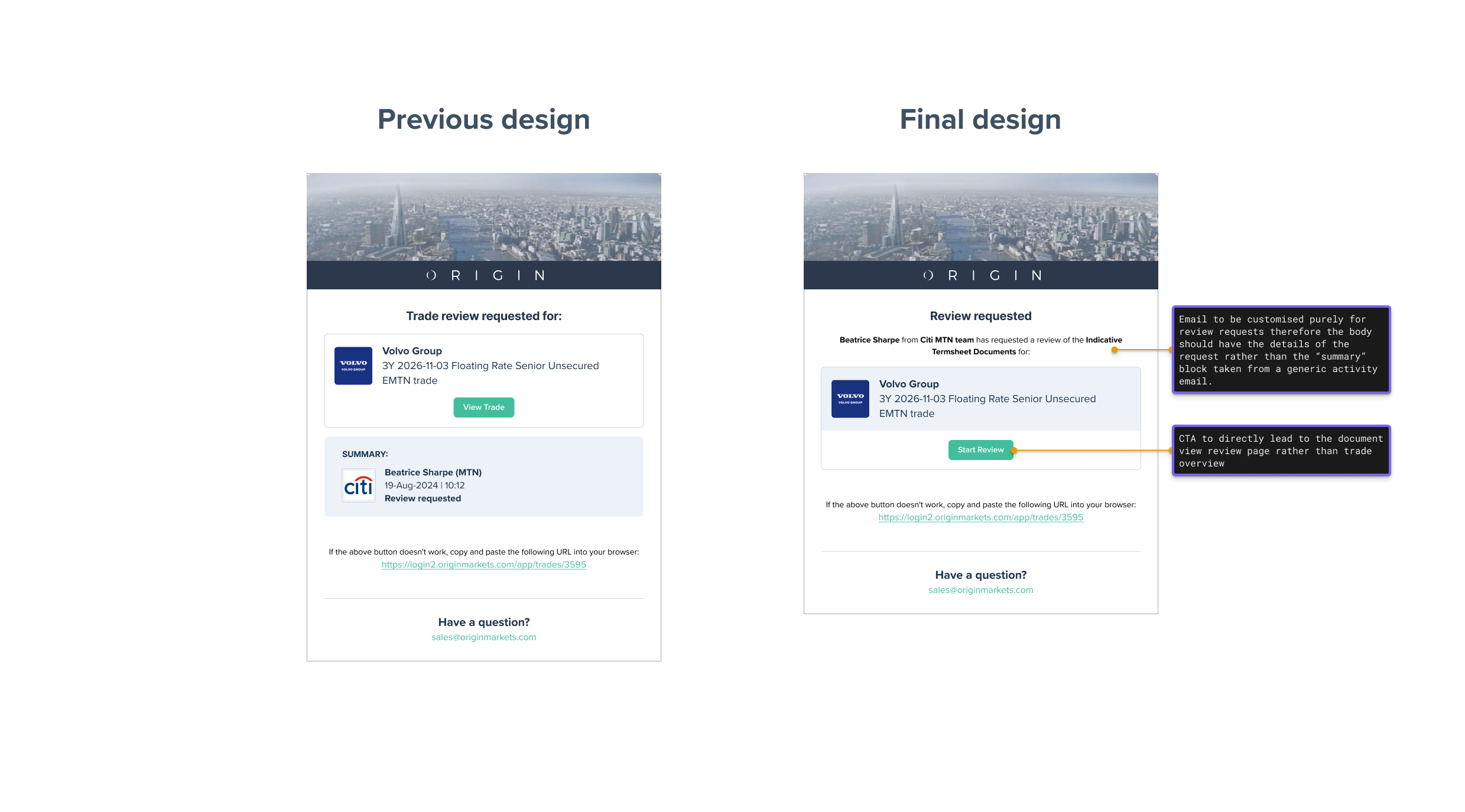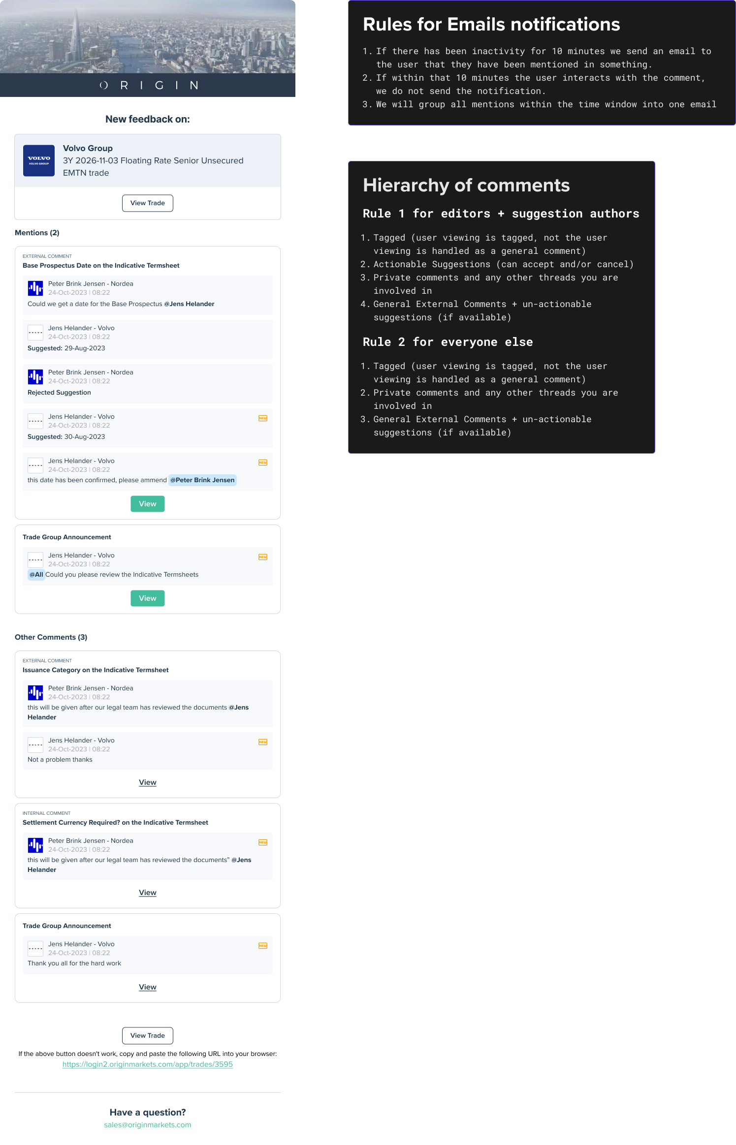 With many of our earlier clients having strong security requirements regarding communication and actions on the platform, the notification system was built accordingly sending an email notification for every action done as well as when action is required. This meant that users were receiving about 50 separate emails per trade. Not only is the volume too high that our clients were complaining but they were unsure of when an email is actually valuable often missing notification to perform actions on the platform. According to our email open rate there is a <10% open rate often at the beginning stages of the trade which seems to mean users often open the first few realising the information is not important so they assume following emails are the same.