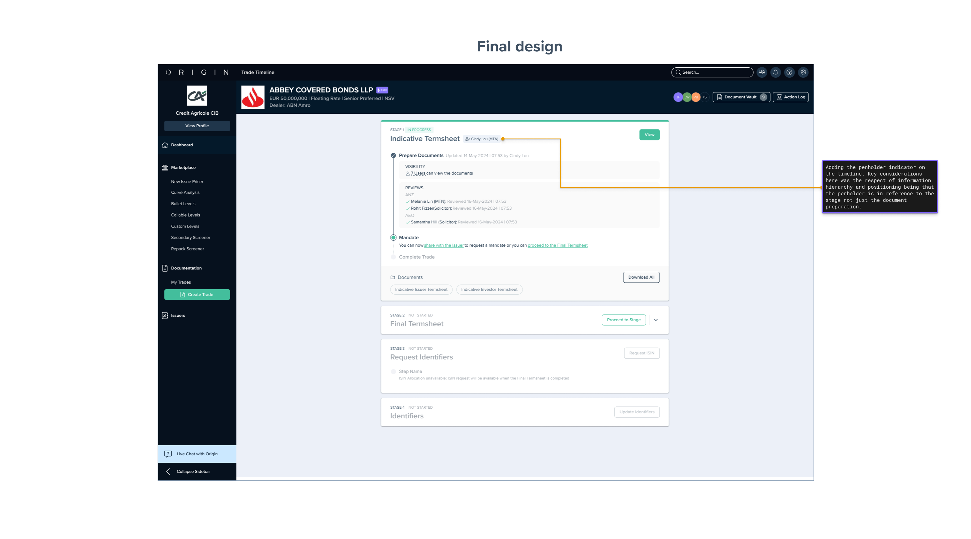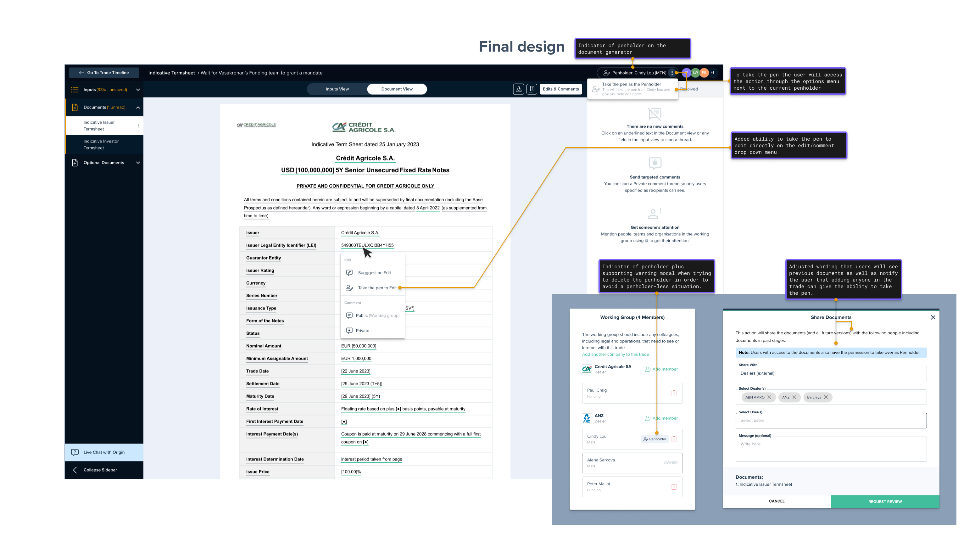 Overall the final design was adding indicators for the penholder, adding warnings of the consequences of taking the pen being potentially destructive and supporting changes to ensure taking the pen was available at the Termsheet stages.