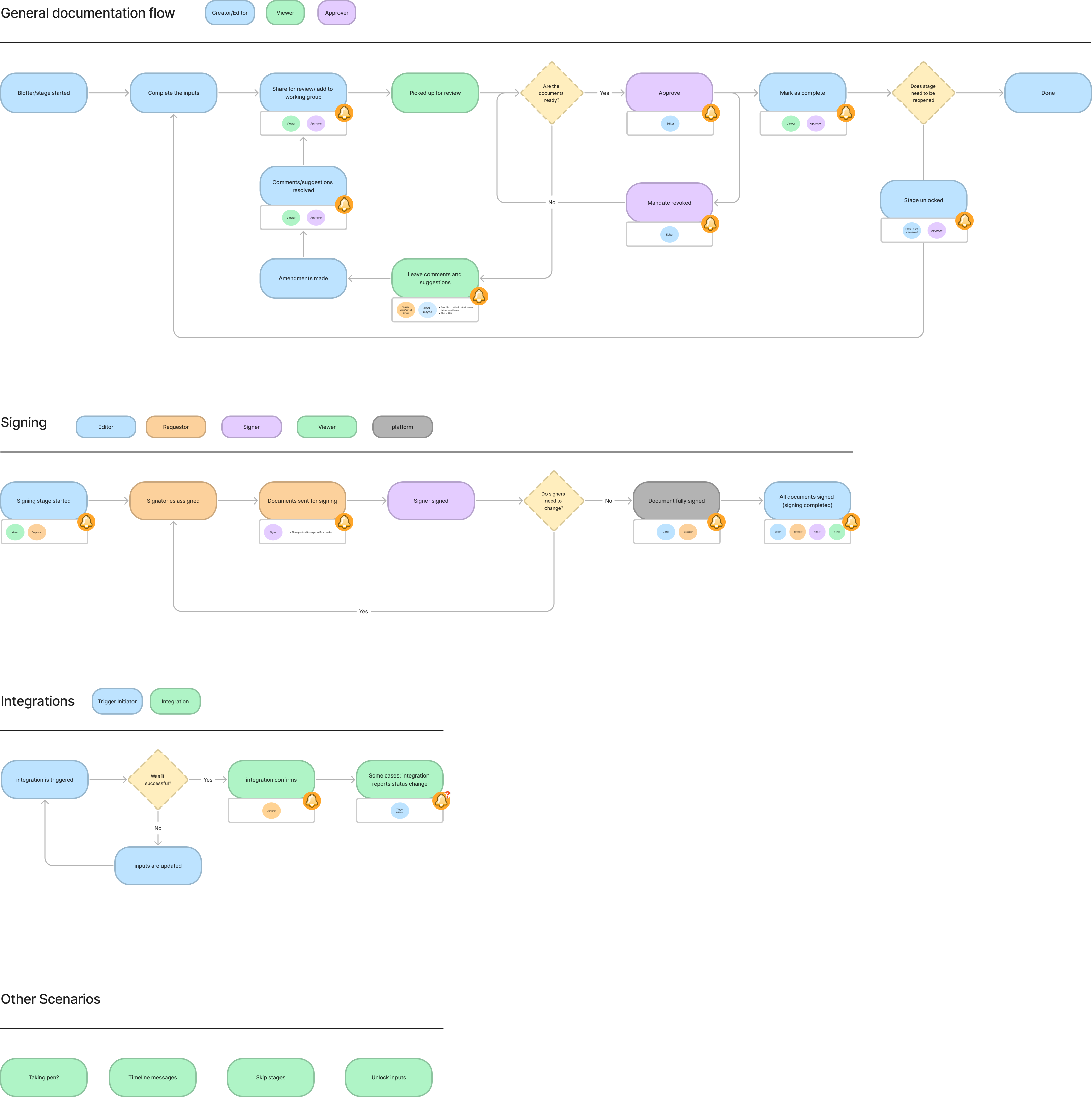 With both of these methodologies agreed on by the wider team, we went ahead to map out the standard user flow to identify key action points and which users are required to be notified. A small issue we ran into was that key roles in a trade doesn’t always correlate to the actions required, especially in the post trade stages where document collaboration is fluid. This made us decide to create new over arching fluid roles based on actions taken on the trade. These were: