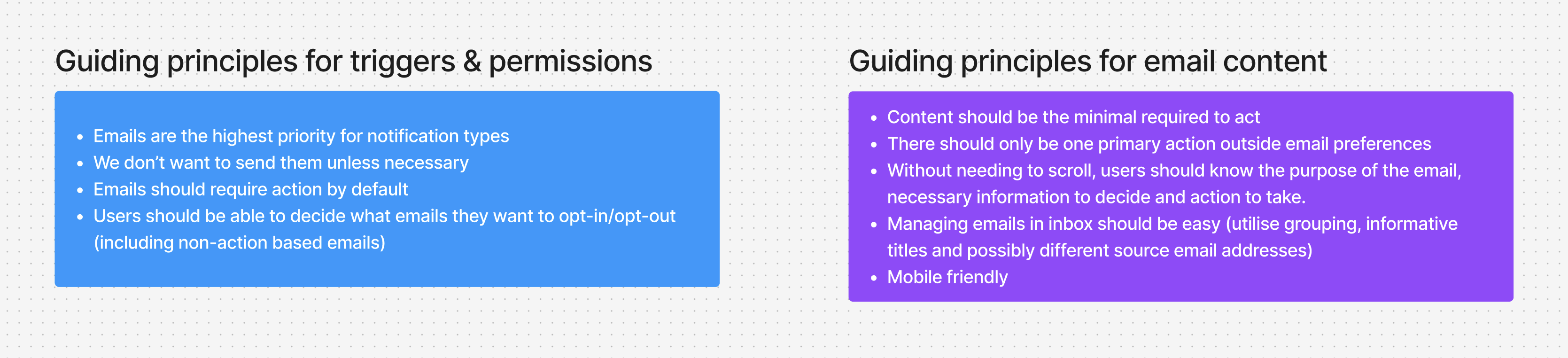Rather than understand and modify the current implementation of notifications, it made more sense to start from the beginning with an email methodology and build on from that. This ensures that whenever we add a feature, we know when to add a notification and that it doesn’t end up to the same state that we have now. Before scrapping the notifications we created a daily digest emails to satisfy some organisation’s security and audit requirements and then began on the key aspect of friction which was the amount of emails and not knowing when an email was important to the user. This made us decide to create a methodology for both when the email notifications are sent and what they contain.