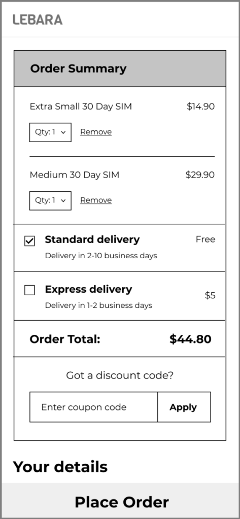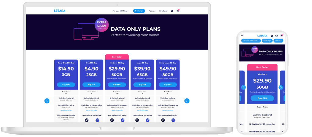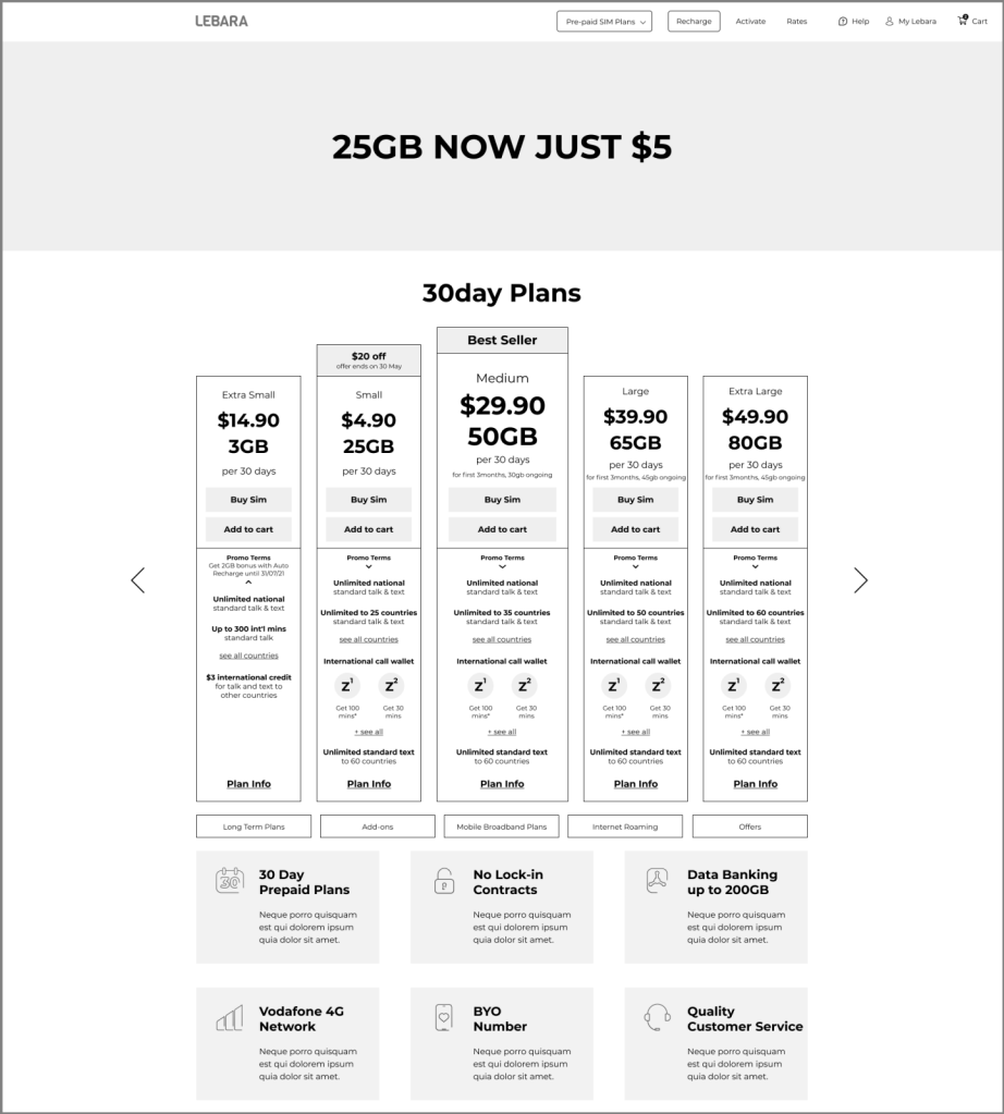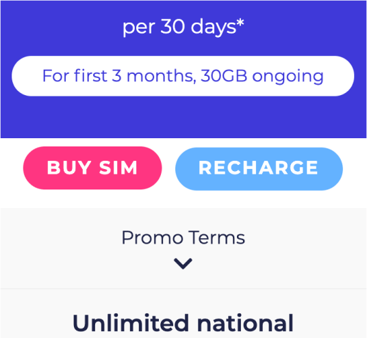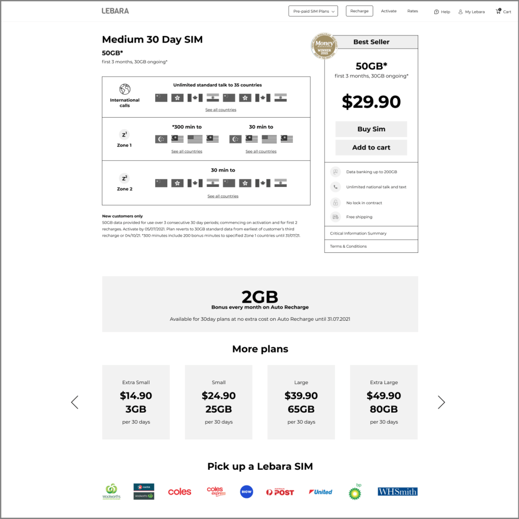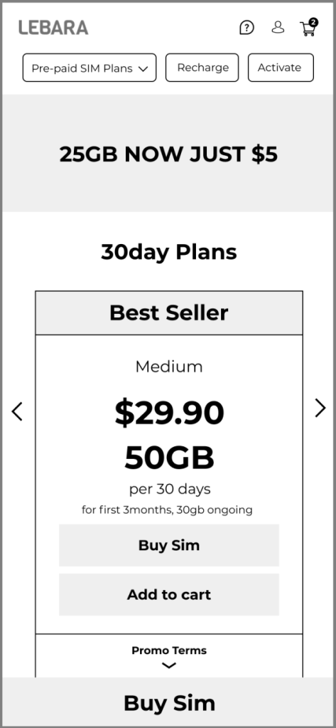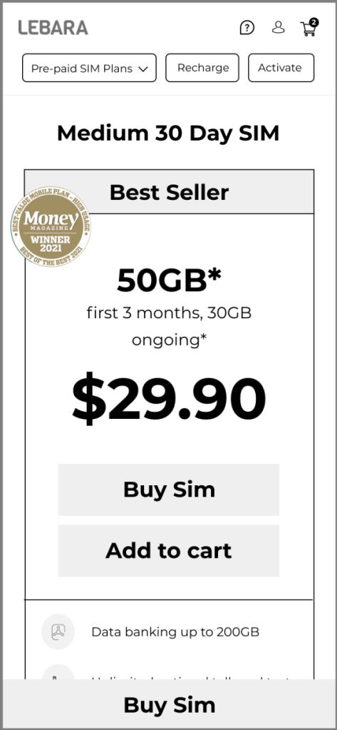 - Minimal use of colour to separate sections of the plan in order to keep focus on Price, Data and the Buy SIM button.