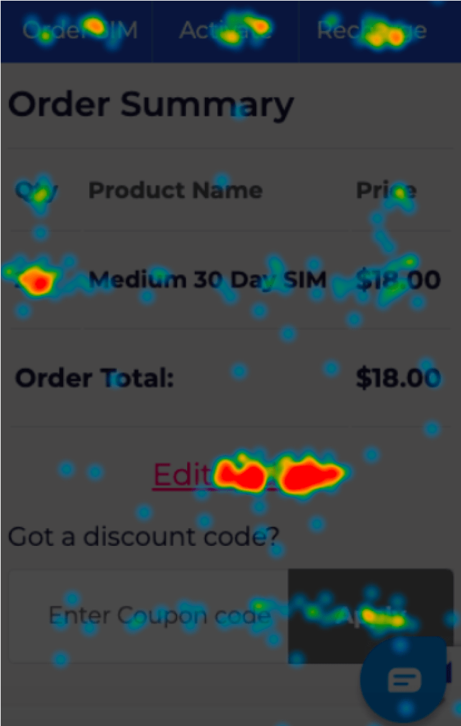 On mobile, the “Edit Order” button is the most popular with 13% of clicks, then the “Place Order” button with 11.6% of clicks. When we look at both devices, it appears that users typically see a quantity of 2 Medium 30 Day SIM’s. We could conclude that the cart easily has 2 products when there should be 1, and that the user needs to take an extra step to edit their order.